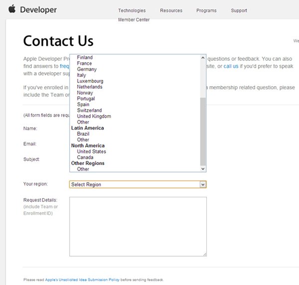 Apple, uygulama geliştiricilere Türkçe destek vermiyor. Apple sitesinden uygulama geliştirici hesabı açılırken, ülke seçeneklerinde Türkiye’nin adı bile geçmiyor. Türkiye’de faaliyet gösteren uygulama geliştiriciler kayıt olmak için, ‘Diğer’ seçeneğini seçmek zorunda.